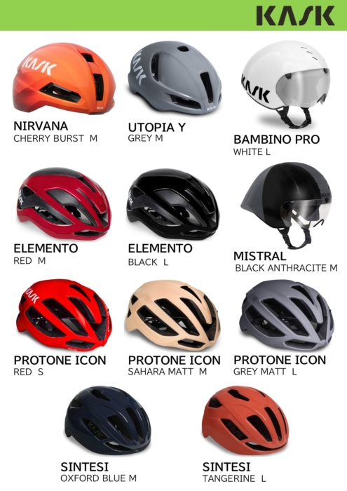 KASKの展示&試着ヘルメットには、エアロタイプのNIRVANAとUTOPIA Y、ハイエンドモデルのELEMENTO、定番モデルとも言えるPROTONE ICON、オールラウンドモデルのSINTESI、そしてTTやトライアスロンに特化したBAMBINO PROにMISTRALと幅広いラインアップをご用意。とくにBAMBINO PROとMISTRALは、なかなかお試しいただく機会がないと思います。ぜひこのPOP-UPにて各モデルのデザインやかぶり心地、サイズ感をご確認ください。