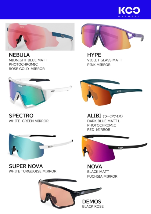 KOOの展示&試着アイウエアには、最新モデルのNEBULAに加え、ハイエンドモデルのHYPE、大きなワンピースレンズが特徴のSPECTRO、ALBIのラージサイズ、リムレス軽量モデルのSUPERNOVAとNOVA、人気モデルのDEMOSをご用意。KOOのアイウエアは、KASKのヘルメットと調和するようデザインされていますが、他ブランドヘルメットと組み合わせてももちろんOK。そのフィット感と優れた視界もぜひご確認ください。
